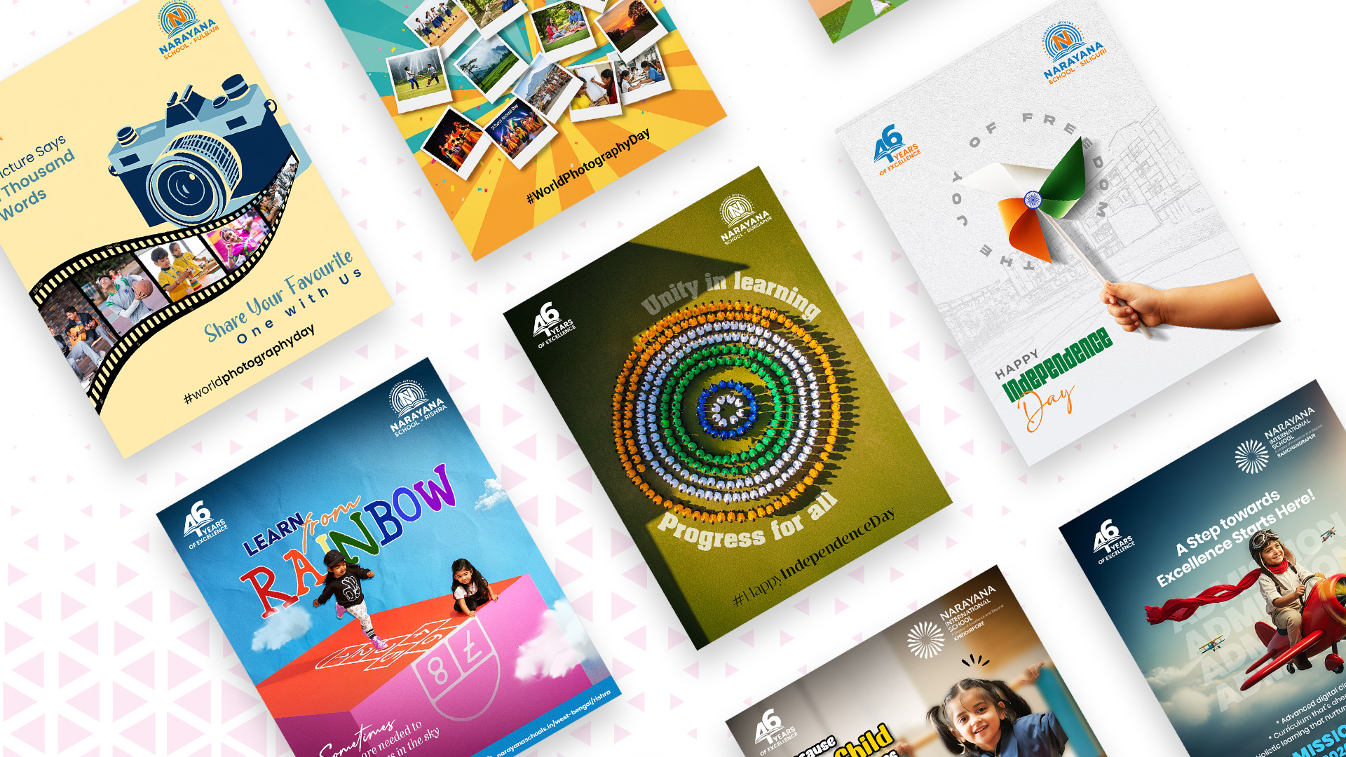 The design aesthetic for Narayana International School was meticulously crafted to represent the school’s ethos of academic excellence, creativity, and student engagement. Our digital campaigns were designed to highlight key events and milestones, while ensuring an attractive and consistent visual style across social media posts, digital banners, and ad creatives. The WhatsApp marketing strategy enabled real-time communication, enhancing lead conversion rates through personalized engagement.