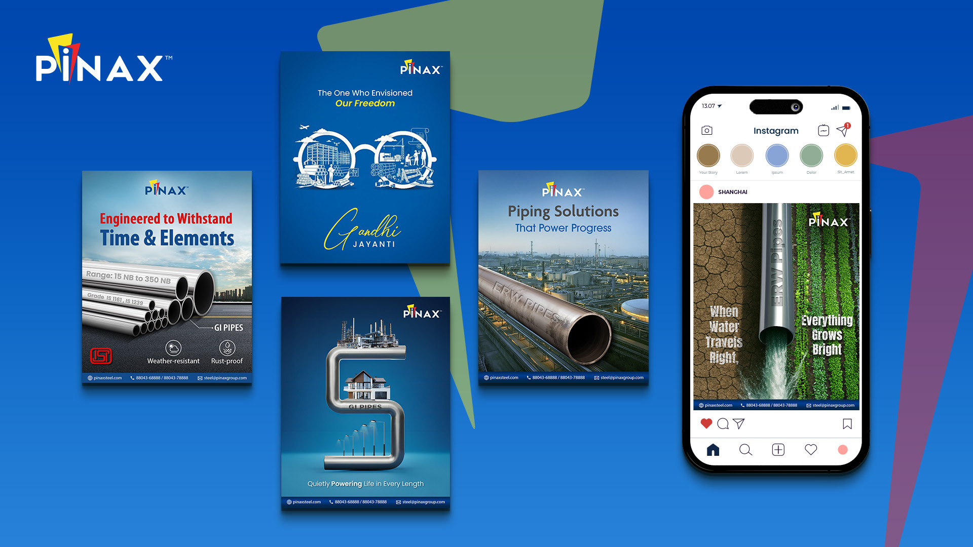 For Pinax’s prospectus, we designed a sleek, informative layout that communicated the brand’s core products, features, and technical details in an engaging and user-friendly way. This was complemented by social media creatives that highlighted their cutting-edge products like GI Pipes and ERW Pipes, along with targeted messaging for Gandhi Jayanti and other key occasions. We also crafted ads and digital banners to drive brand awareness, featuring Pinax’s strength and resilience in various industry contexts.